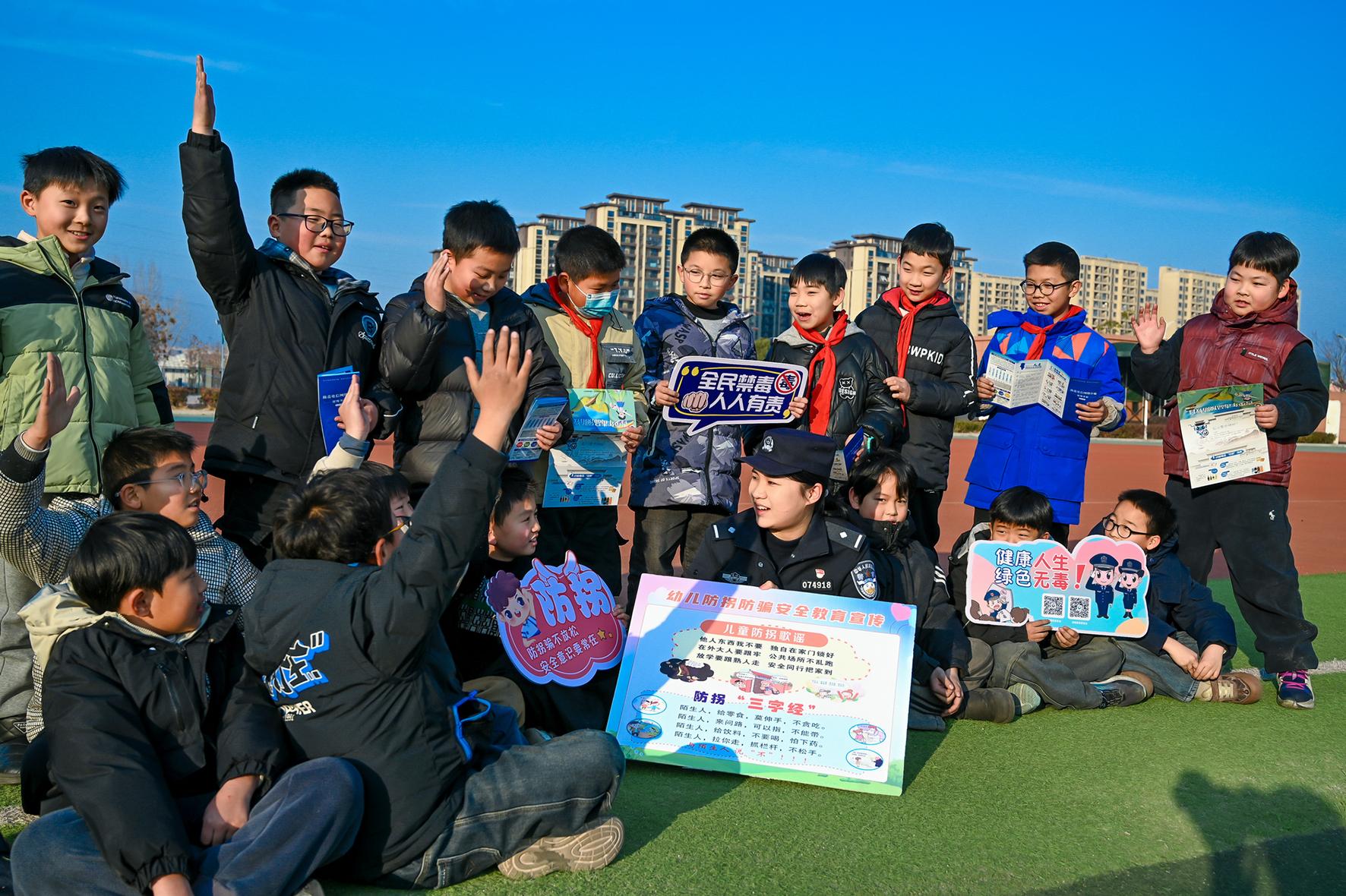1月14日,在安徽省馬鞍山市和縣實(shí)驗(yàn)小學(xué),轄區(qū)歷陽派出所民警在給學(xué)生講解防拐、防騙、交通安全等知識(shí)。寒假來臨,該縣公安機(jī)關(guān)及時(shí)開展“假前最后一課”宣傳活動(dòng)。