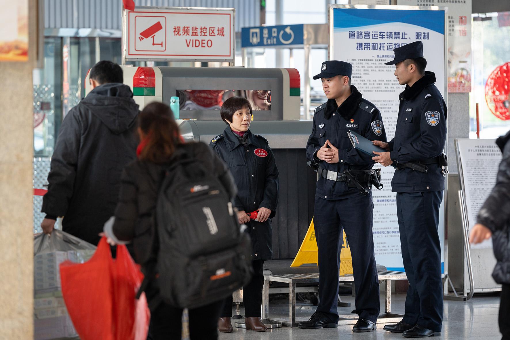 1月16日,四川省綿陽市公安局涪城區(qū)分局花園派出所民警向車站工作人員了解春運期間車站安全相關事宜。