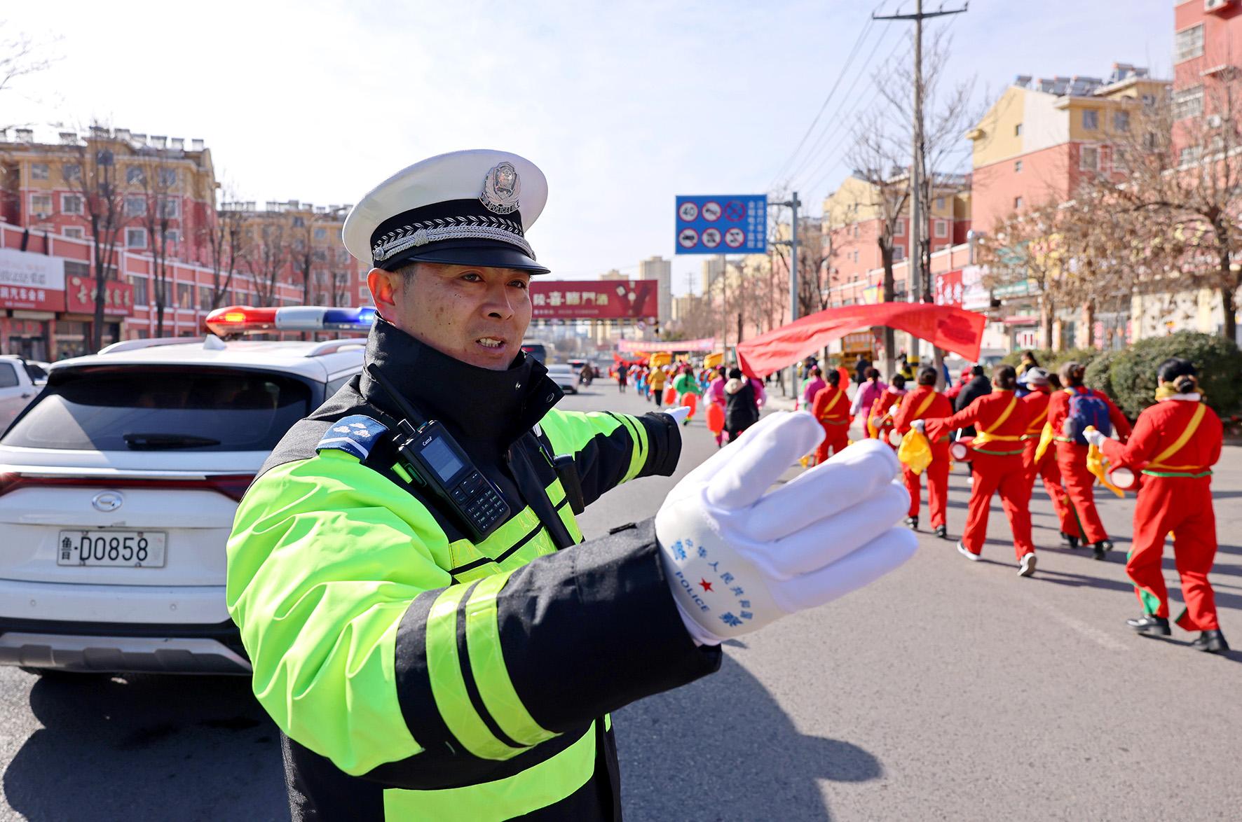 2月5日,山東省棗莊市公安局市中分局交通警察大隊(duì)組織民輔警走向街頭,服務(wù)民間游藝“踩街”表演活動(dòng)。