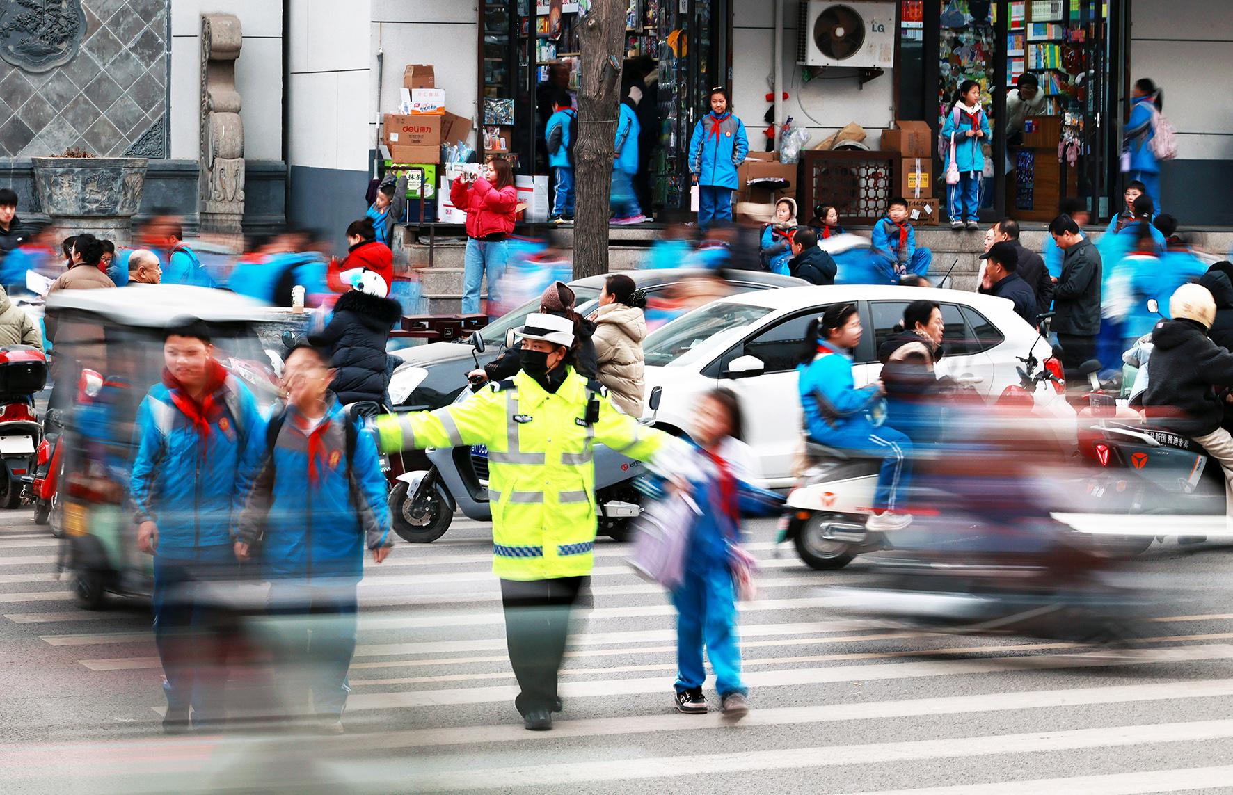 2月18日,山西省運(yùn)城市新絳縣交警大隊(duì)古城中隊(duì)“學(xué)雷鋒”護(hù)學(xué)崗一名輔警在西街實(shí)驗(yàn)小學(xué)校門(mén)口護(hù)送小學(xué)生安全通過(guò)斑馬線(xiàn)。