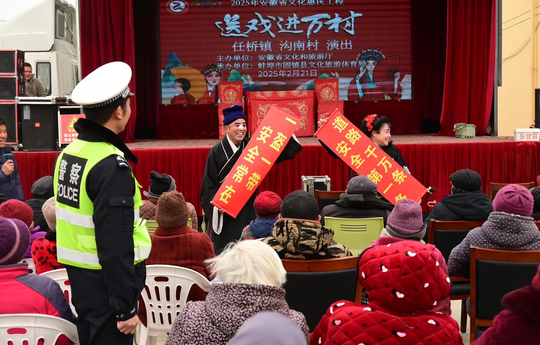 2月21日,安徽省蚌埠市固鎮(zhèn)縣公安局交管大隊(duì)組織警力隨“送戲進(jìn)萬(wàn)村”活動(dòng)走進(jìn)任橋鎮(zhèn)溝南村,開展“美麗鄉(xiāng)村行”交通安全主題宣傳活動(dòng)。