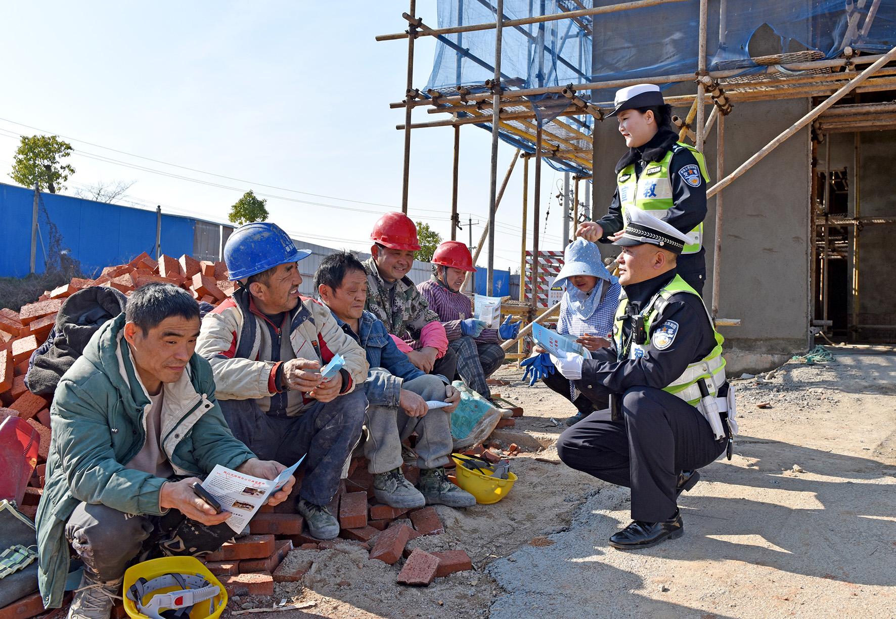 圖為民警向公路沿線建筑工地務(wù)工人員普及交通安全知識(shí)。