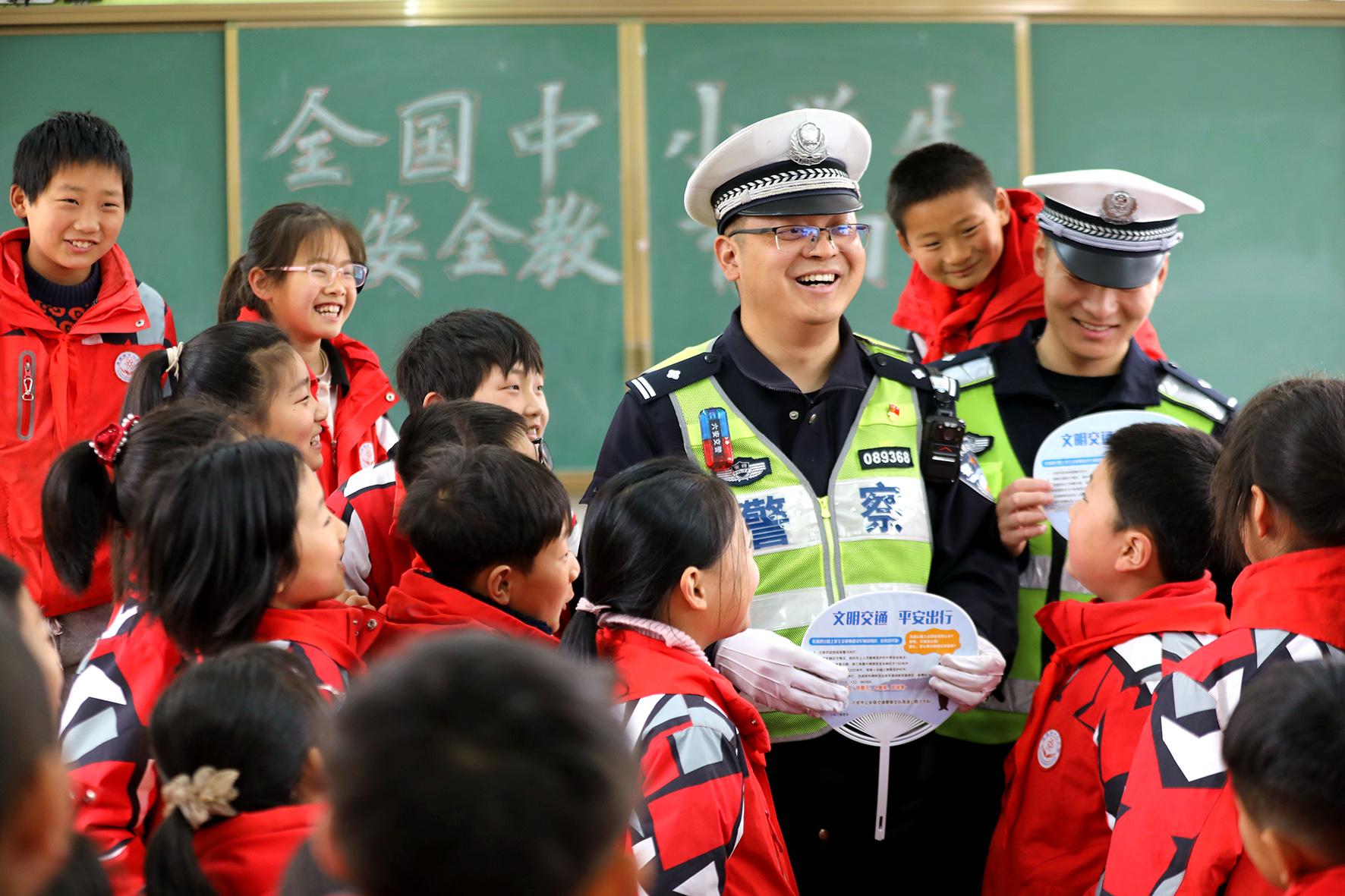 3月27日,安徽省阜南縣公安局交管大隊組織民警輔警走進(jìn)轄區(qū)中小學(xué)校開展交通安全知識宣傳活動。
