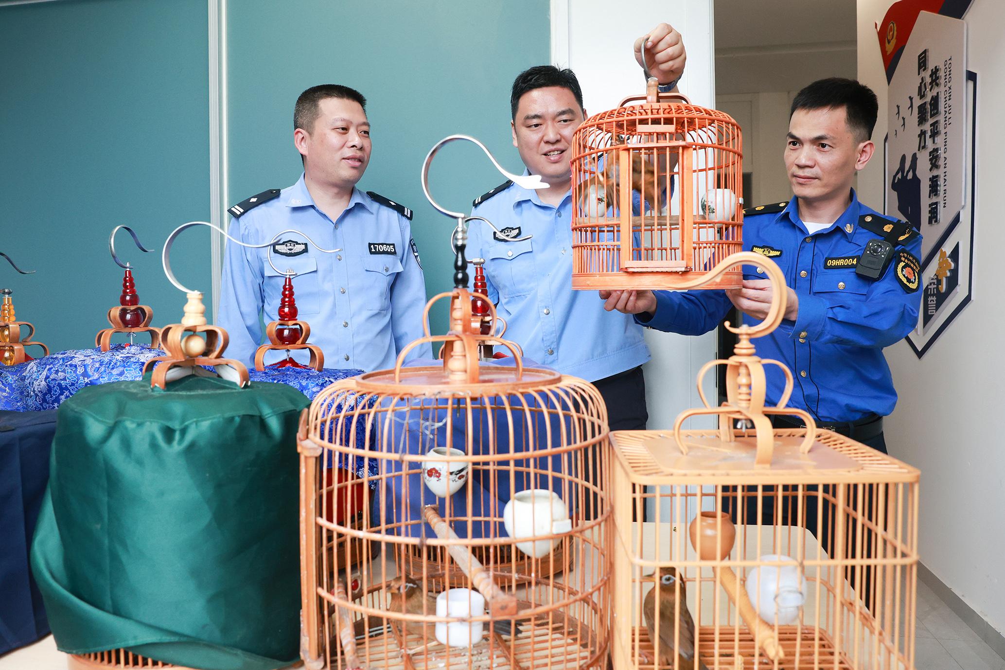 圖為民警和林業(yè)執(zhí)法人員對查獲畫眉鳥進(jìn)行鑒定。