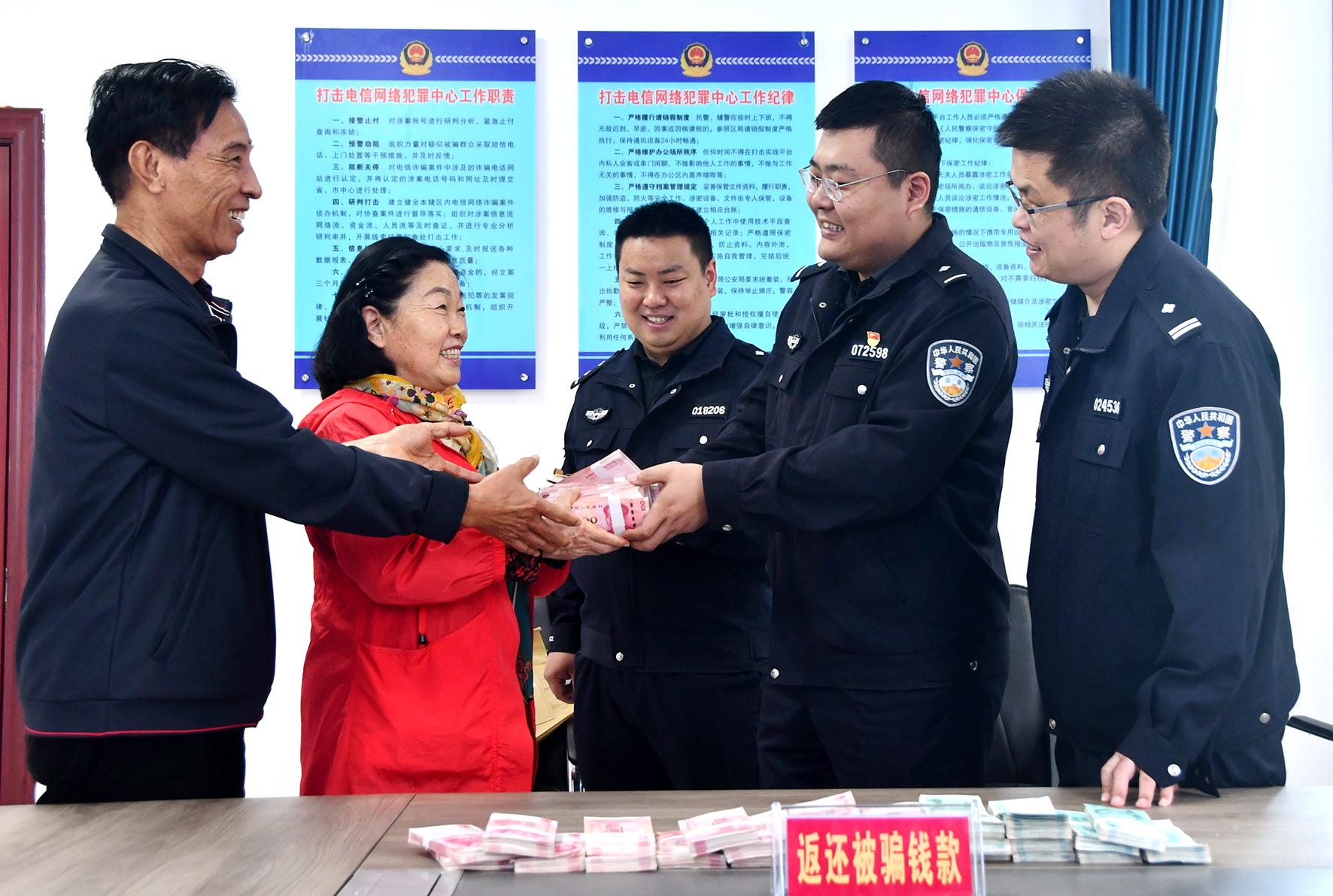 4月22日,河北省邯鄲市永年區(qū)公安局刑警大隊(duì)機(jī)動(dòng)中隊(duì)舉行返贓儀式,將近日破獲的一起電信網(wǎng)絡(luò)詐騙案追回的30萬(wàn)元涉案錢(qián)款返還給群眾。