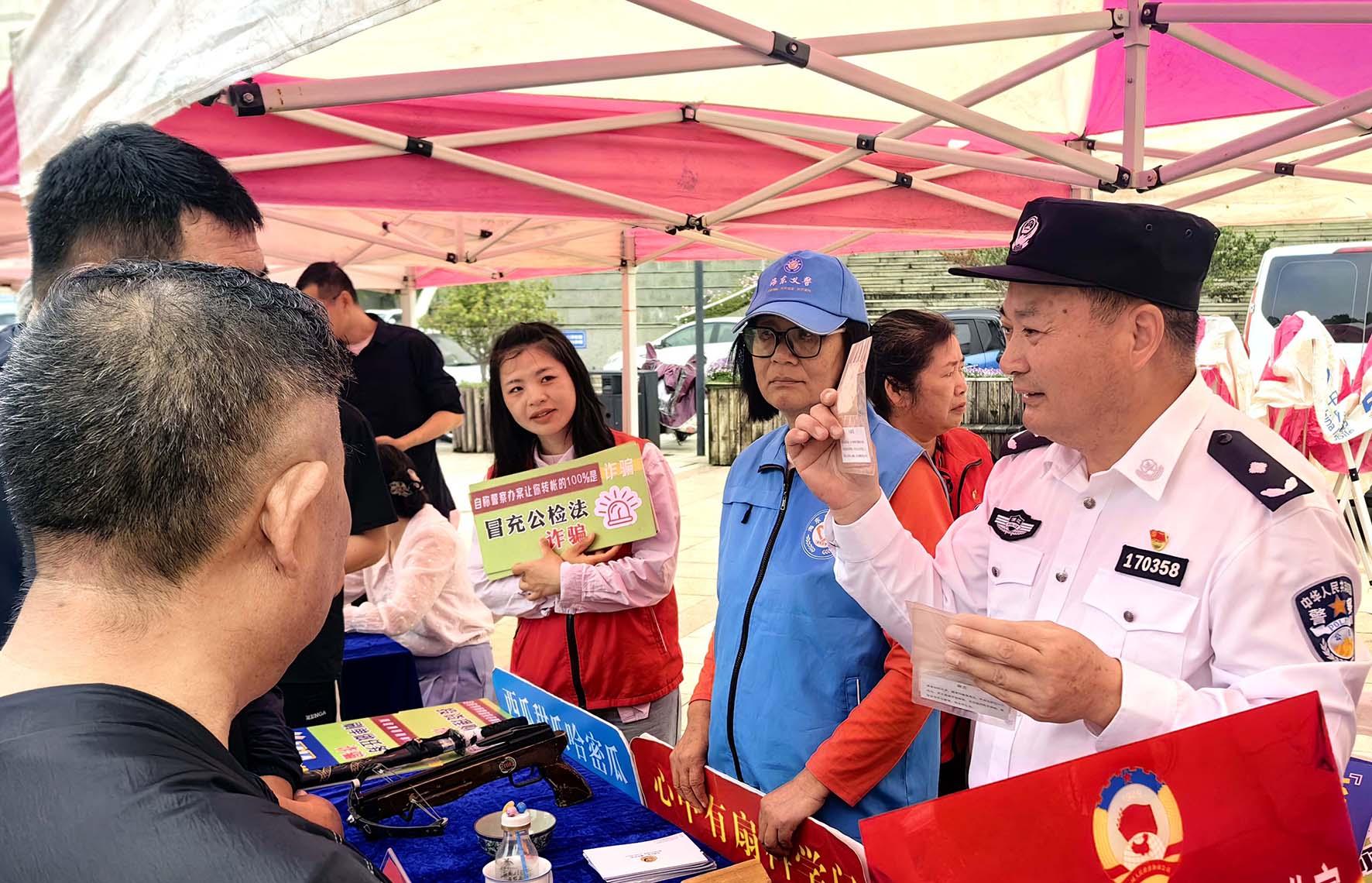 5月9日,全國優(yōu)秀人民警察、二級英模、浙江省臺州市公安局椒江分局海門派出所社區(qū)民警阮林根走上街頭,通過擺攤設點的方式開展安全防范宣傳活動。
