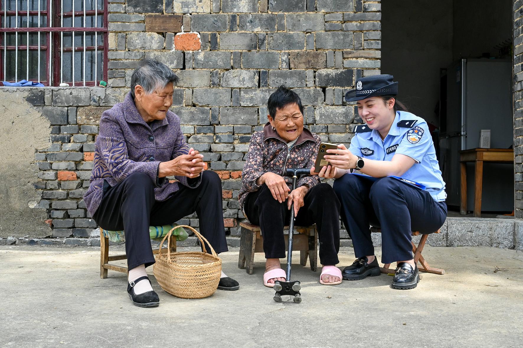 5月13日,在安徽省馬鞍山市和縣歷陽鎮(zhèn)興圩村,村警王雪純利用手機現(xiàn)場向老年人講解防范電信網(wǎng)絡詐騙知識。