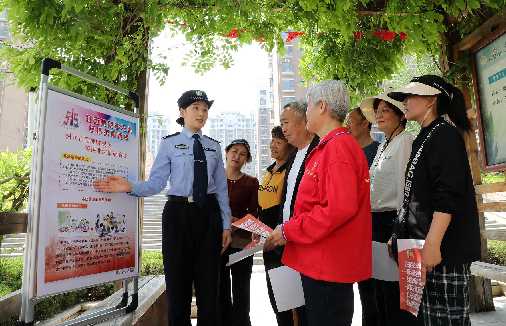 5月14日,山東省博興縣公安局經(jīng)濟犯罪偵查大隊民警在博昌街道錦繡社區(qū)向社區(qū)居民講解打擊和防范經(jīng)濟犯罪知識。