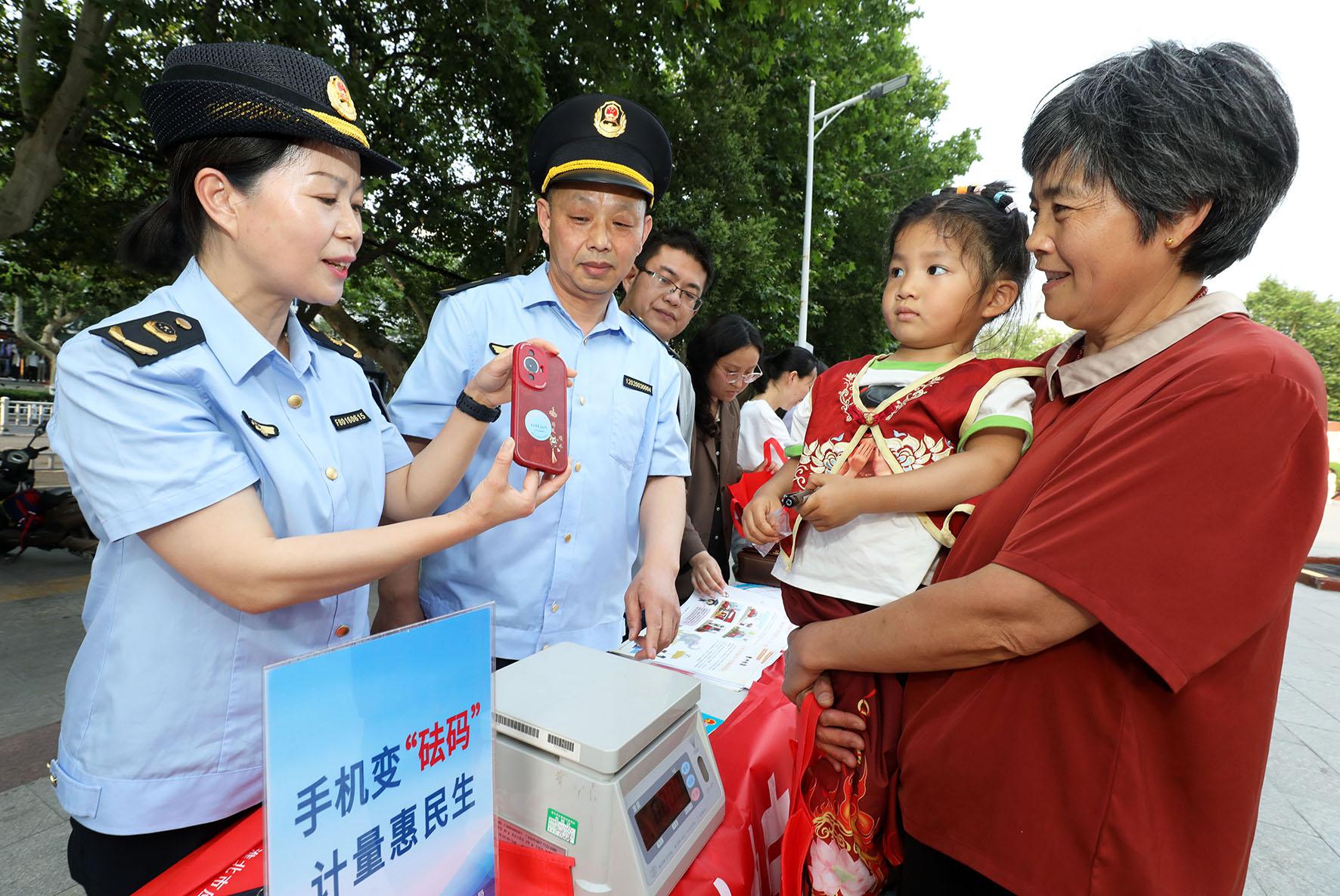5月16日,在“世界計量日”到來之際,安徽省淮北市市場監(jiān)督管理部門在淮海路舉行“手機(jī)變砝碼 計量惠民生”電子計價秤防作弊科普宣傳活動。