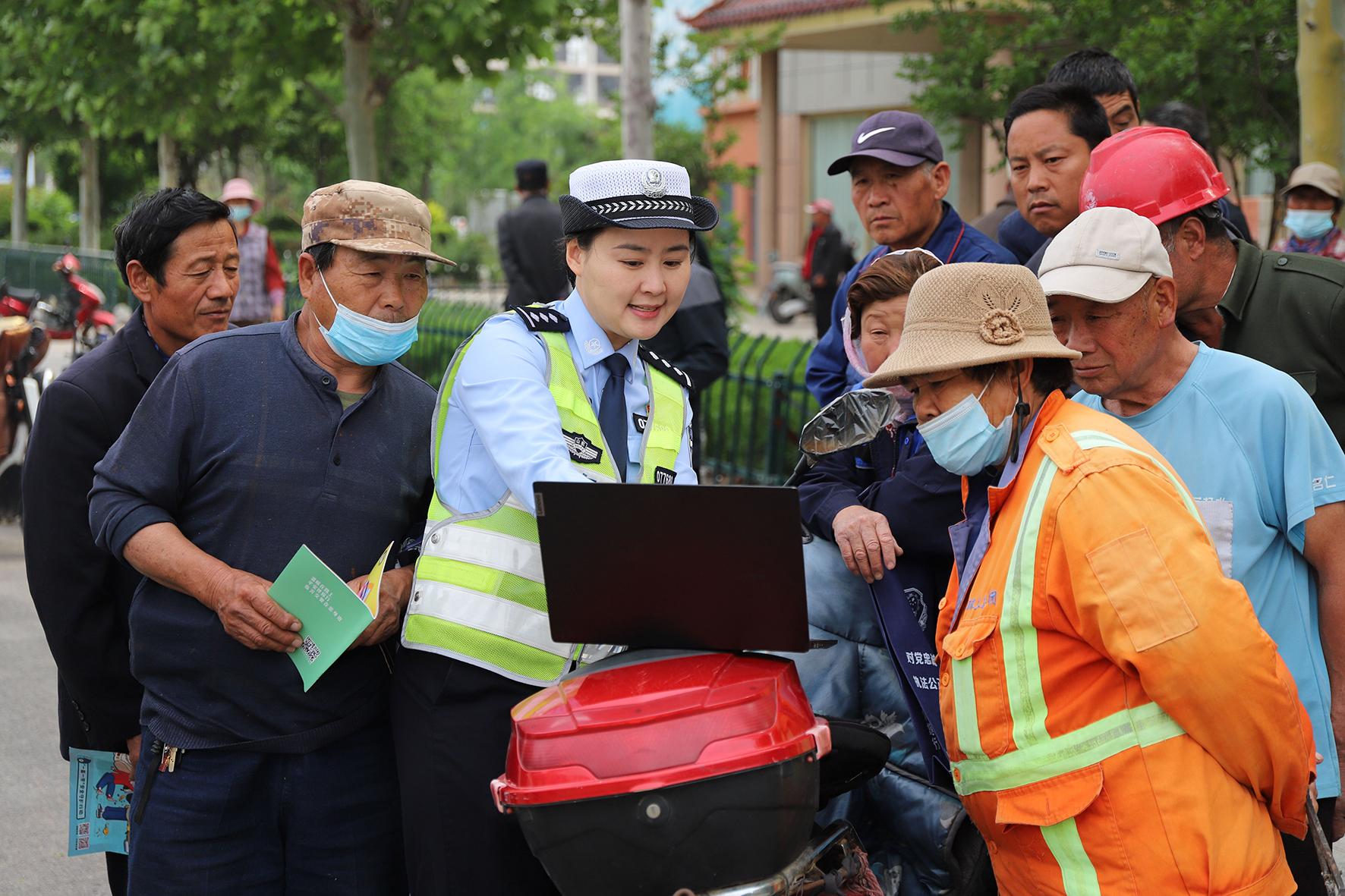 5月20日,山東省臨沂市公安局交警支隊郯城大隊民警輔警結(jié)合務(wù)工人員出行特點,向他們普及道路交通法律法規(guī)和安全知識。