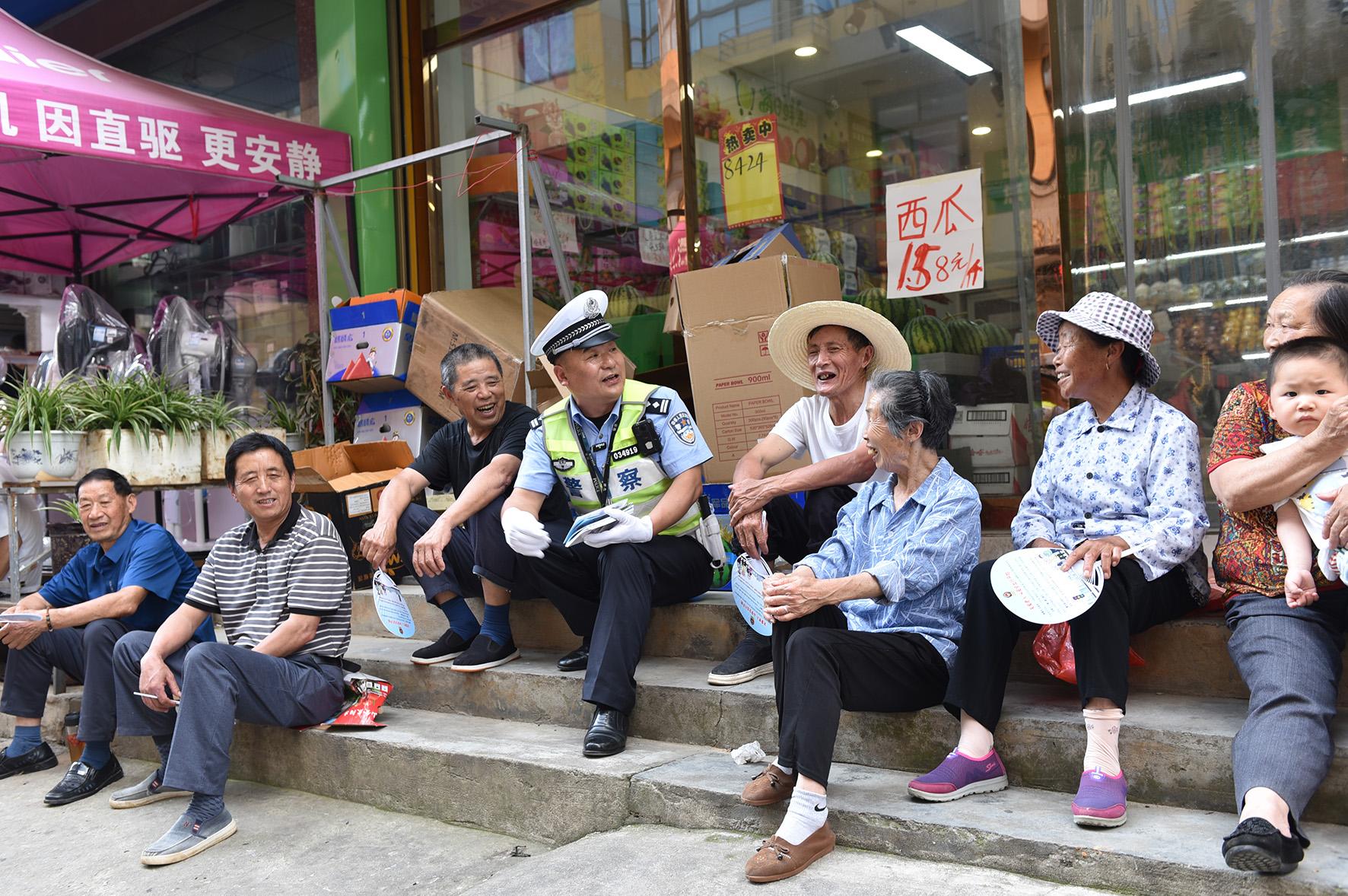 5月21日,安徽省宿松縣公安局交警大隊民輔警深入農(nóng)村集鎮(zhèn),現(xiàn)場向居民宣講夏季道路交通安全注意事項。