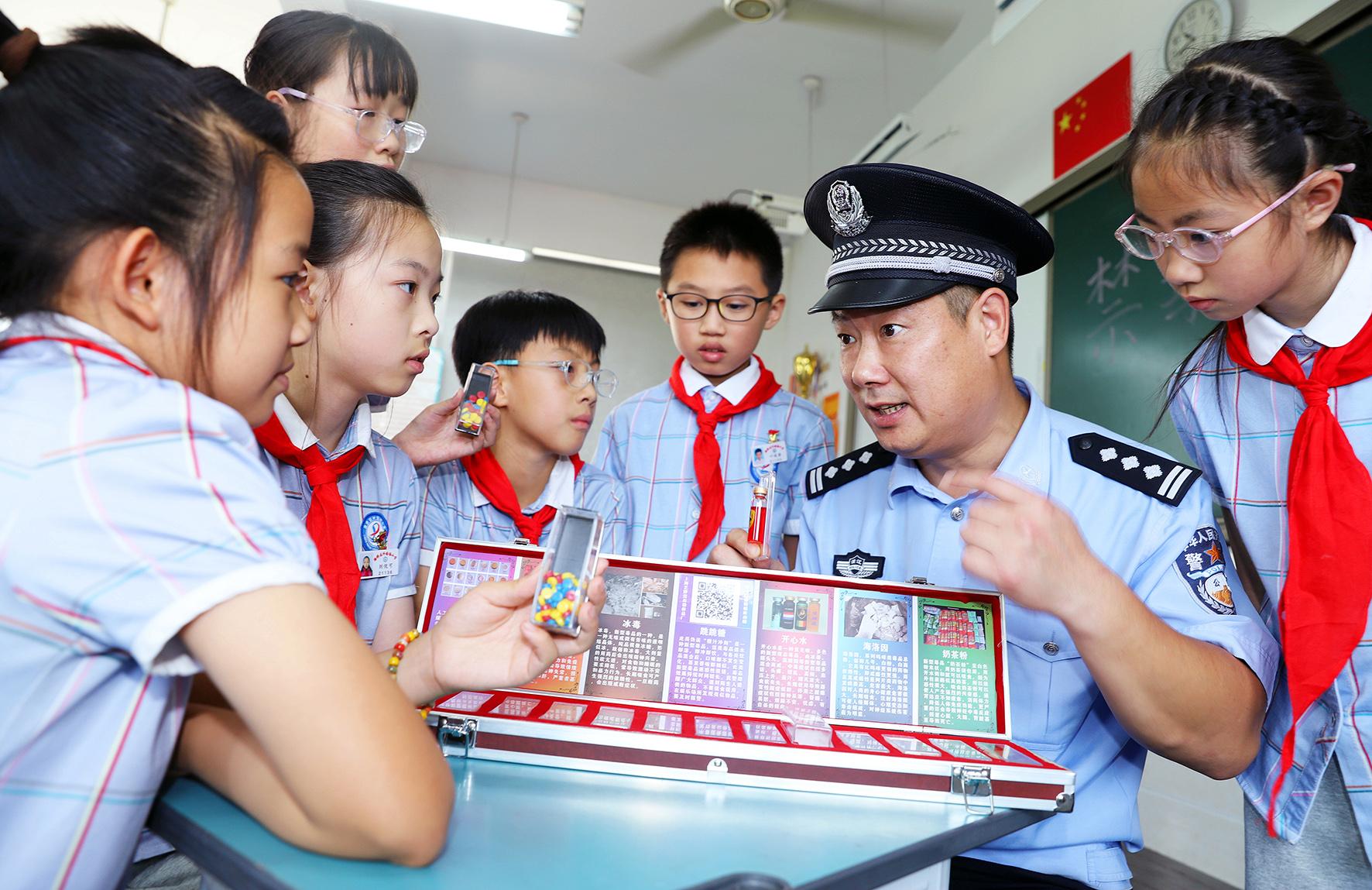 6月17日,浙江省臺州市路橋區(qū)桐嶼派出所民警在路橋區(qū)外國語小學向小朋友講解毒品的危害。