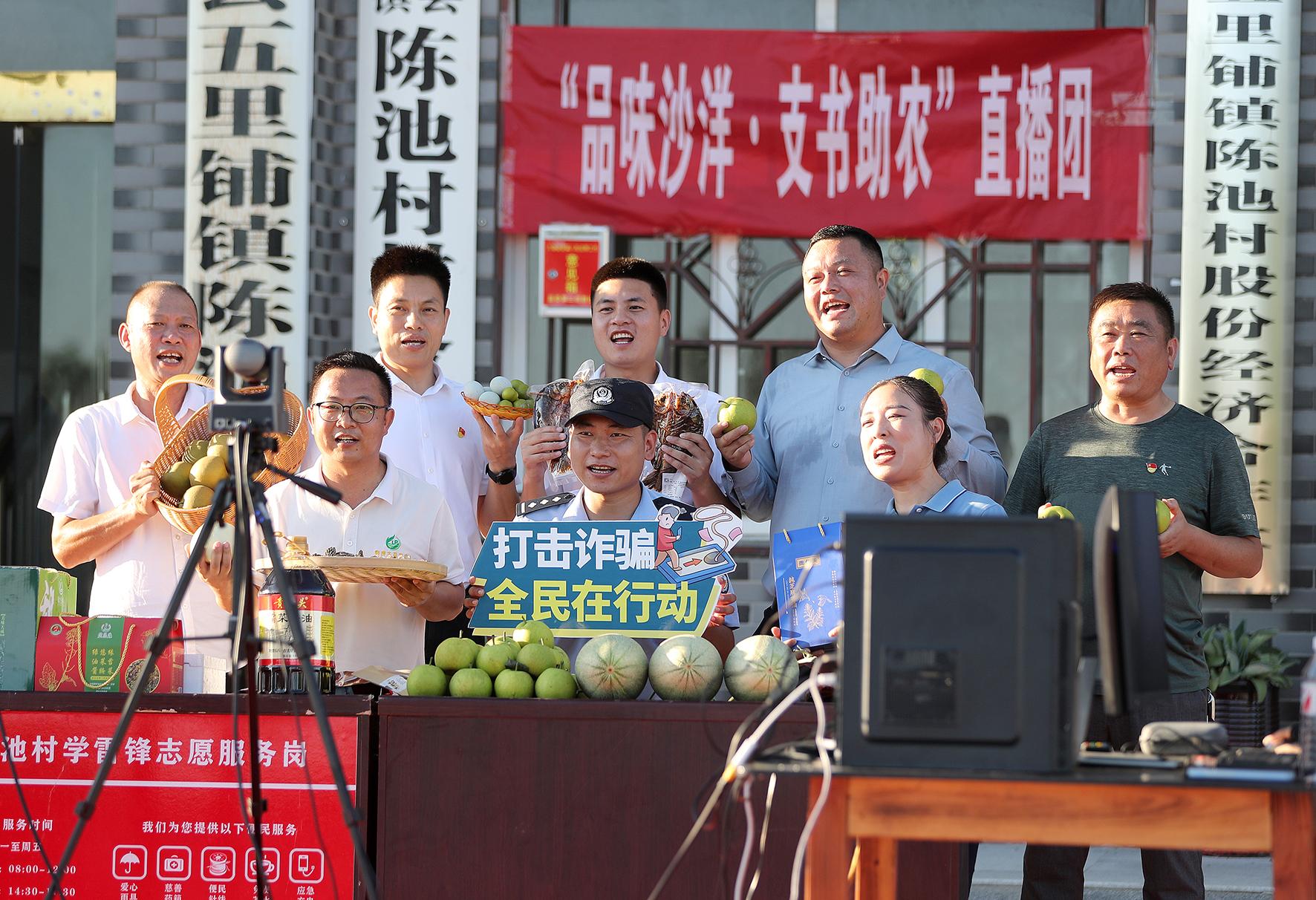 7月3日傍晚,在湖北省沙洋縣五里鋪鎮(zhèn)陳池村,沙洋縣公安局五里派出所民警和7位村支書,通過網絡直播的形式向千家萬戶開展反詐禁毒宣傳。