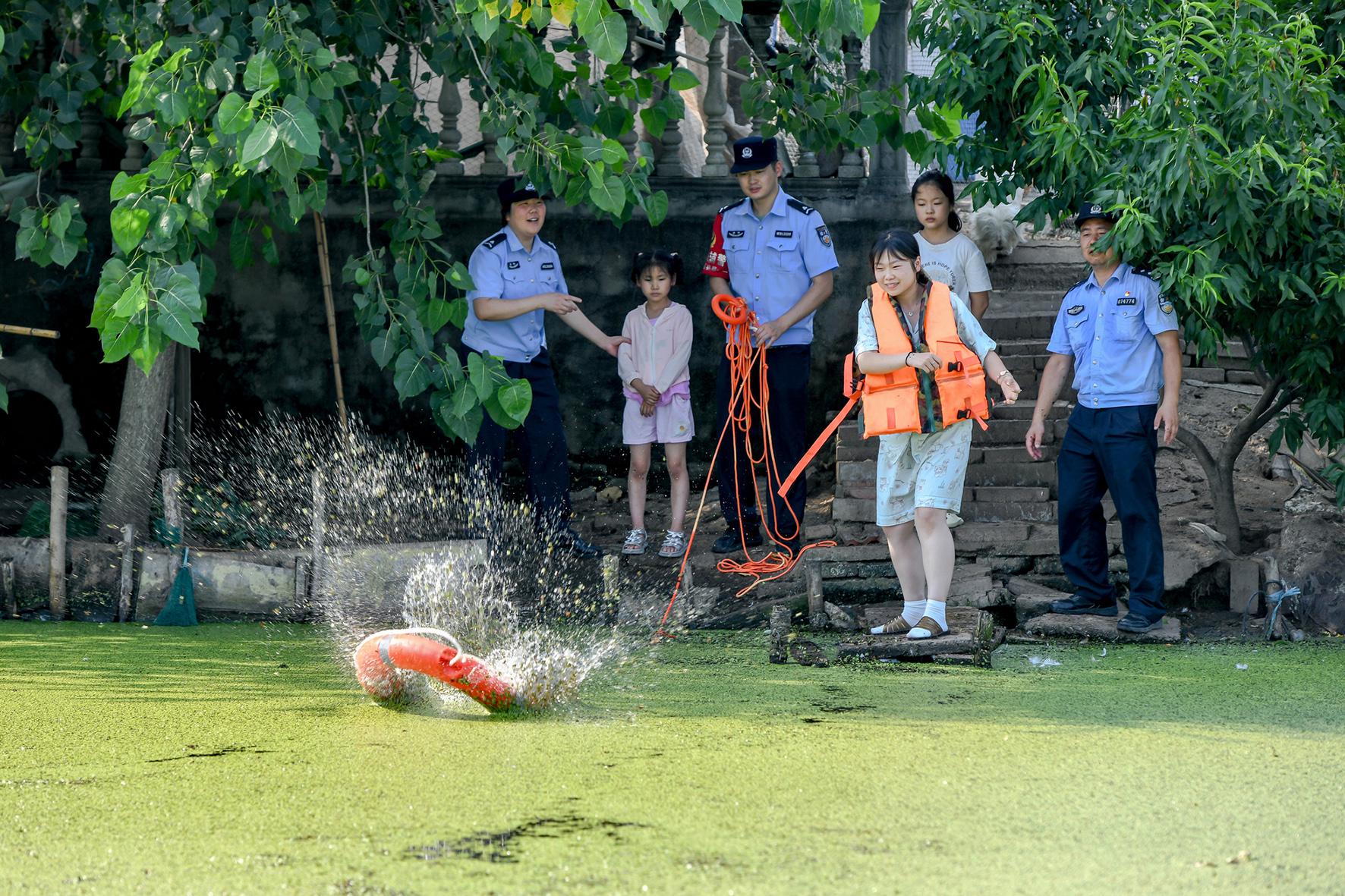 7月6日,在安徽省馬鞍山市和縣歷陽鎮(zhèn)萬壽村,和縣公安局“村警”向未成年人講解“防溺水”知識,傳授救生設備的使用方法。