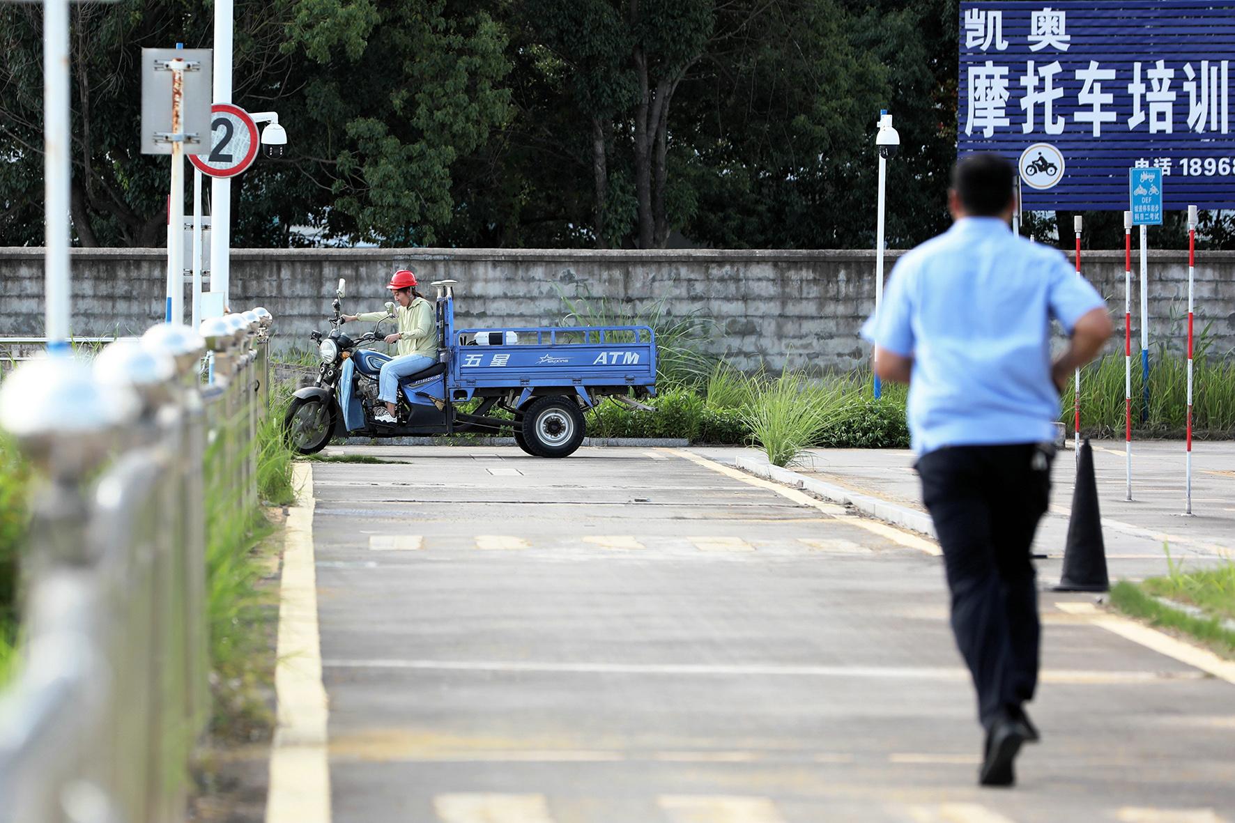 7月4日,安徽省寧國市公安局交通管理大隊車輛管理所民警輔警在高溫橙色預(yù)警天氣下堅守崗位,持續(xù)為摩托車駕駛學(xué)員們提供駕考服務(wù)。