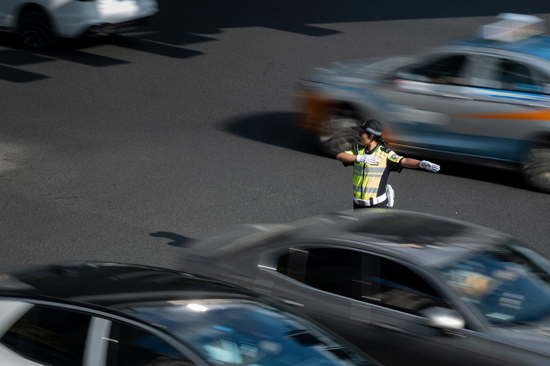 圖為7月9日,直屬一大隊(duì)民警在城區(qū)臨園路嶺南路口執(zhí)勤。