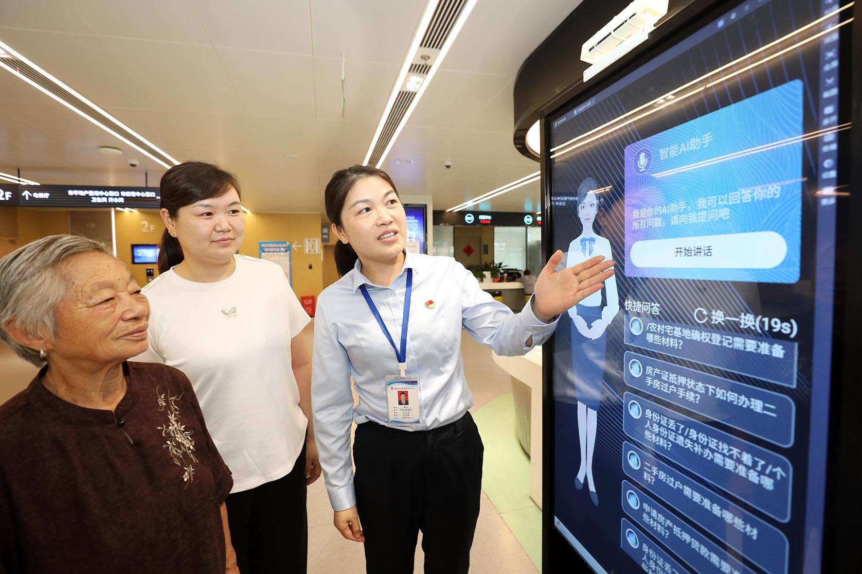 7月15日,安徽省淮北市政務(wù)服務(wù)大廳不動(dòng)產(chǎn)登記窗口工作人員利用“智能AI助手”指導(dǎo)辦事群眾進(jìn)行咨詢業(yè)務(wù)。當(dāng)日,淮北市政務(wù)服務(wù)大廳不動(dòng)產(chǎn)登記窗口“智能AI助手”投入使用,設(shè)備具有智能詢問解答導(dǎo)服功能,支持辦事群眾通過快捷、語音等多種方式進(jìn)行交互。