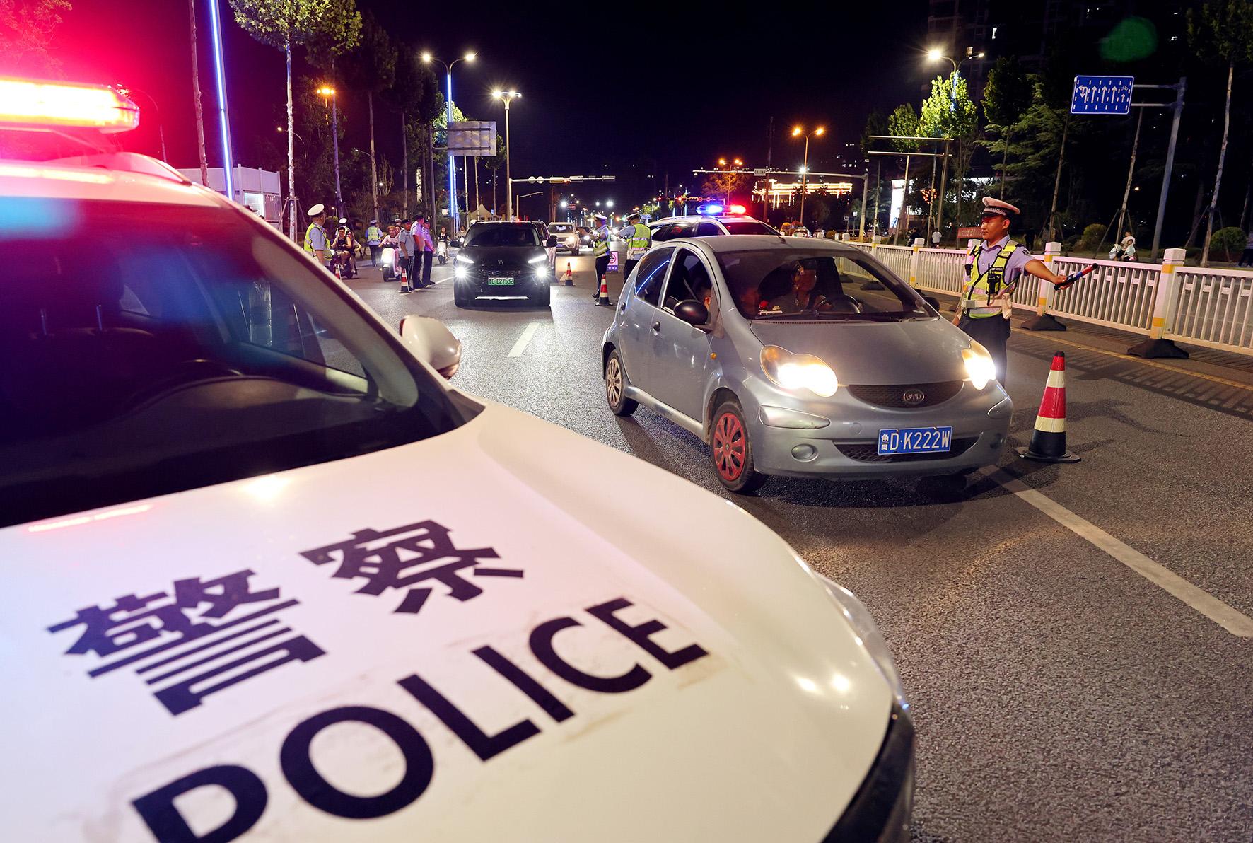 7月25日,山東省棗莊市公安局市中分局交通警察大隊組織民輔警在重點道路對車輛進行檢查,嚴防酒駕等交通違法行為。