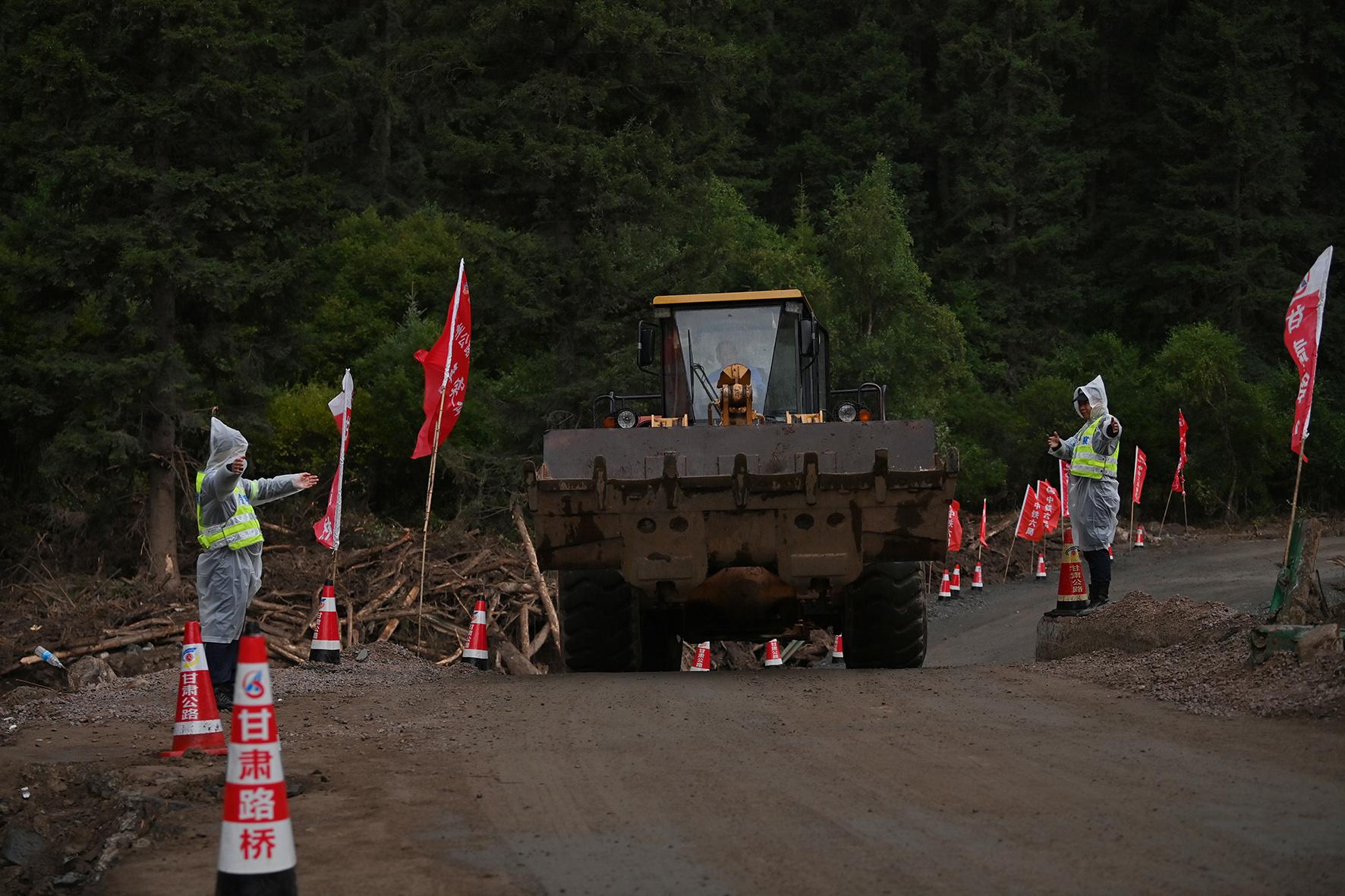 圖為8月13日,執(zhí)勤警力在搶通道路沿線開展工作。