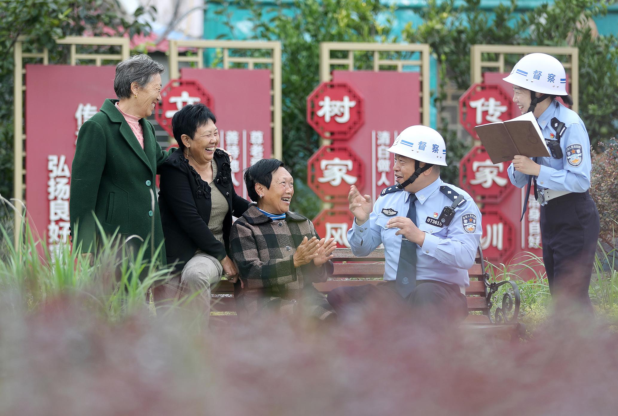 9月22日,在湖北省荊門(mén)市沙洋縣三峽土家族村,沙洋縣公安局督察大隊(duì)民警與村民“嘮家常”,傾聽(tīng)群眾對(duì)公安服務(wù)的需求與建議。