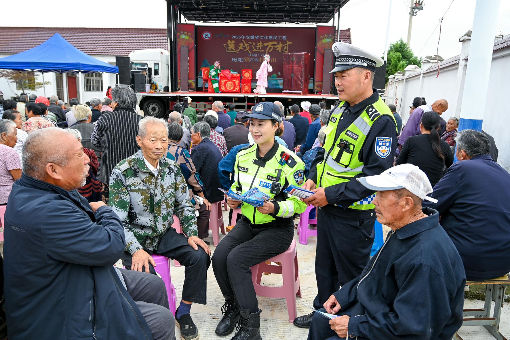 10月17日,安徽省馬鞍山市和縣公安局民警在歷陽鎮(zhèn)萬壽村“送戲下鄉(xiāng)”活動現(xiàn)場,向村民們開展交通安全知識宣傳。