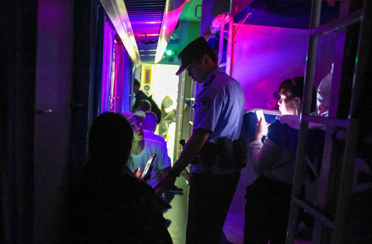 10月14日,劉濤在K845次列車臥鋪車廂開展夜間巡查時提示旅客保管好貴重物品。