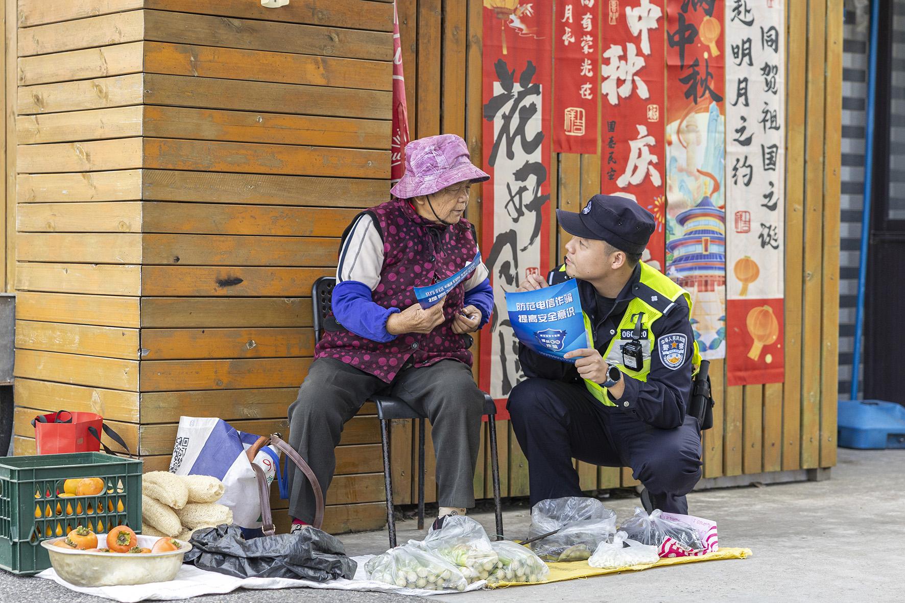 10月23日,上海市公安局崇明分局建設(shè)派出所民警來到轄區(qū)鄉(xiāng)間集市,向擺攤的商戶宣傳防范電信網(wǎng)絡(luò)詐騙知識。