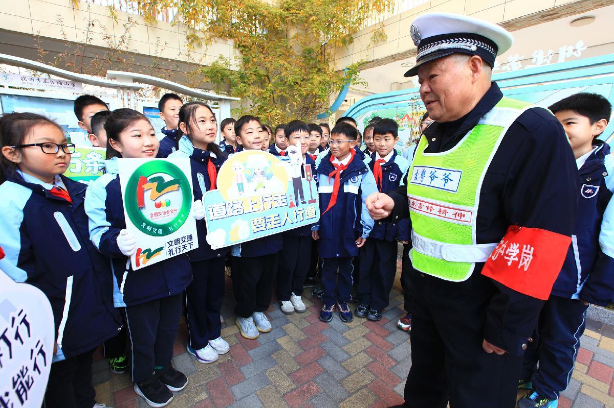 12月1日,江蘇省徐州市蘇堤路小學(xué)開展“文明交通伴‘童’行”主題活動,邀請被同學(xué)們親切地稱為“交警爺爺”的退休警察陳孟軍來校講解交通安全知識。