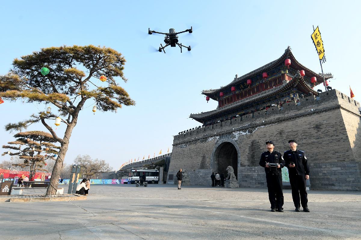 圖為1月4日,民輔警正在古城景區(qū)進(jìn)行警用無(wú)人機(jī)飛行訓(xùn)練。