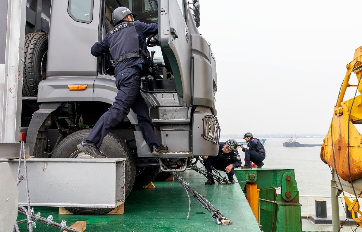 圖為民警對離港船舶進行查驗。