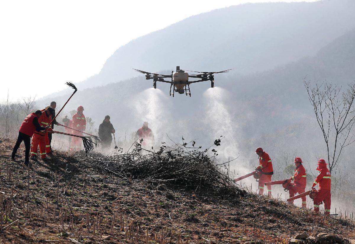 圖為1月7日,應(yīng)急隊員操縱無人機(jī)進(jìn)行火情偵察、熱源定位與低空滅火等森林防火實戰(zhàn)演練。