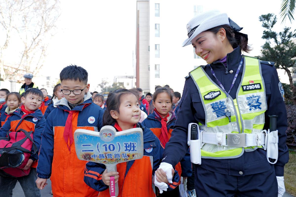 圖為1月15日,護(hù)學(xué)崗執(zhí)勤民警護(hù)送孩子們過馬路。