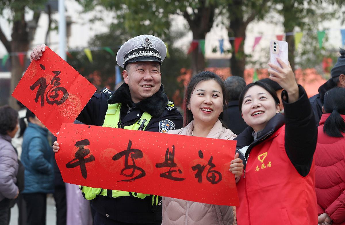 1月17日,湖北省荊門市公安局交管支隊東寶大隊民警在東寶區(qū)仙居鄉(xiāng)年貨大集上,開展“送春聯(lián)話平安”主題活動。