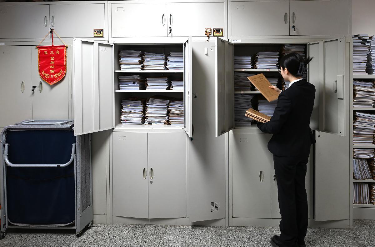 2025年12月31日下午5時,北京市朝陽區(qū)人民法院民三庭法官助理熊格將2025年審結(jié)最后一個案件的卷宗整理好、放入卷柜中。
