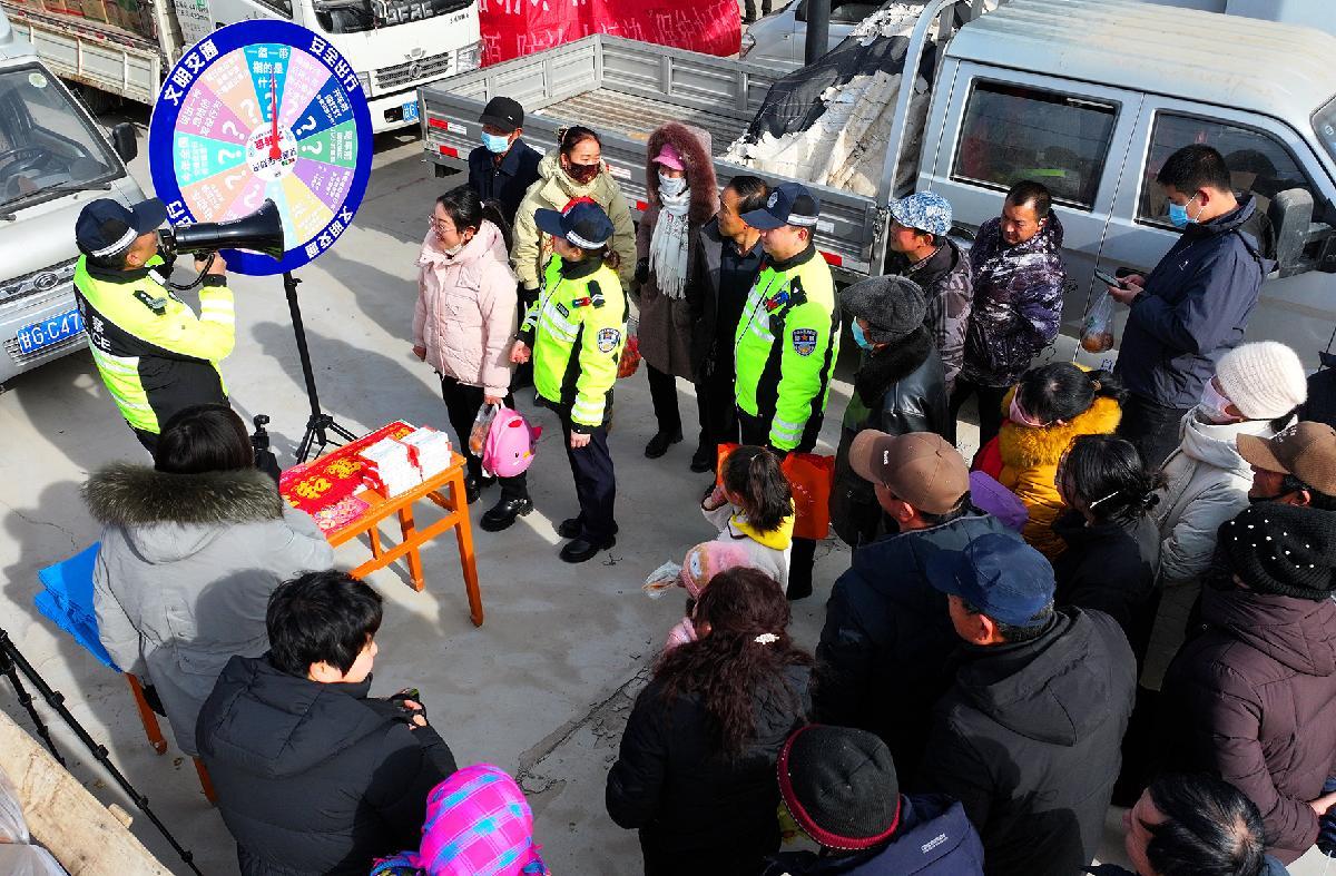 2月2日,甘肅省臨澤縣公安局交管大隊(duì)民輔警來到蓼泉鎮(zhèn)年貨市場(chǎng),通過有獎(jiǎng)競(jìng)答、體驗(yàn)VR、發(fā)放宣傳資料等方式開展交通安全宣傳。