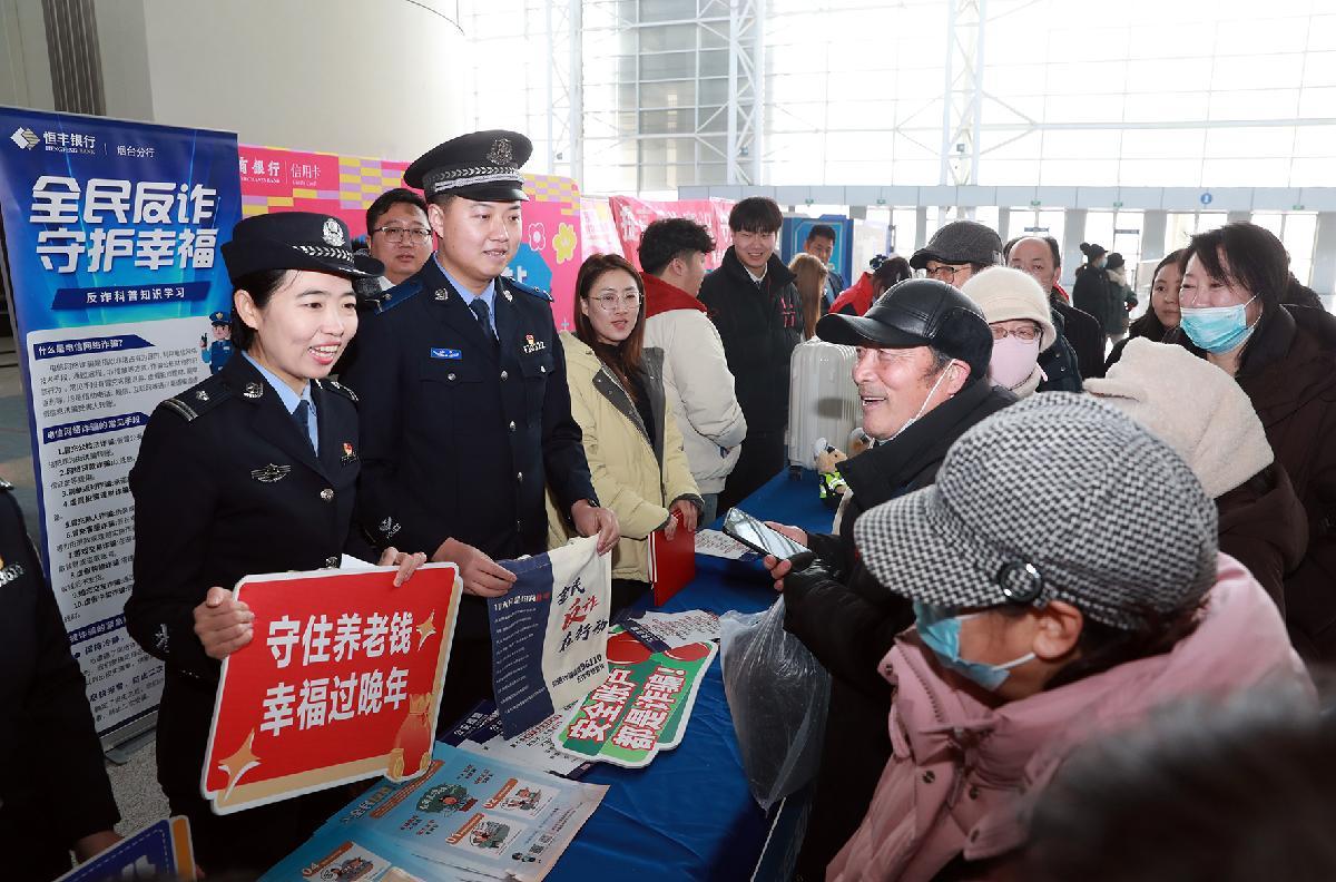 圖為2月5日,民輔警在煙臺國際會展中心海洋大集現(xiàn)場向群眾宣傳反詐知識。