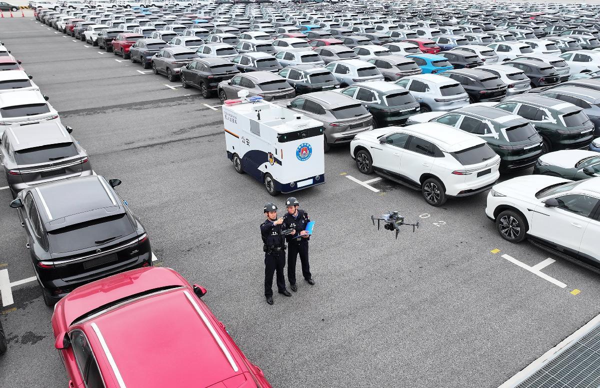 圖為民警使用警用無人機和無人巡查車在碼頭汽車堆場巡查。