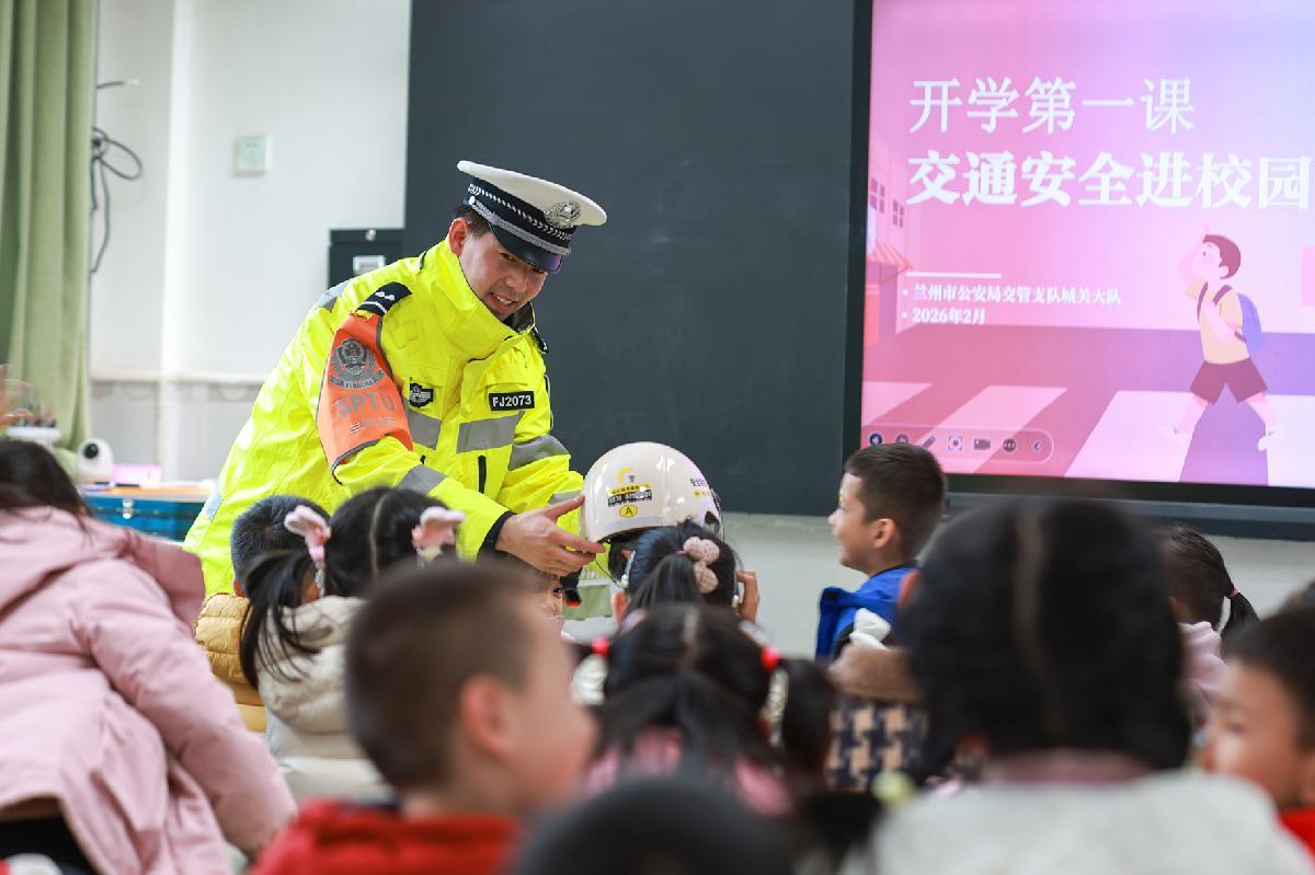 2月25日,甘肅省蘭州市公安局交管支隊(duì)城關(guān)大隊(duì)輔警在城關(guān)區(qū)水車園小學(xué)民勤街分校,為學(xué)生們講解交通安全知識。