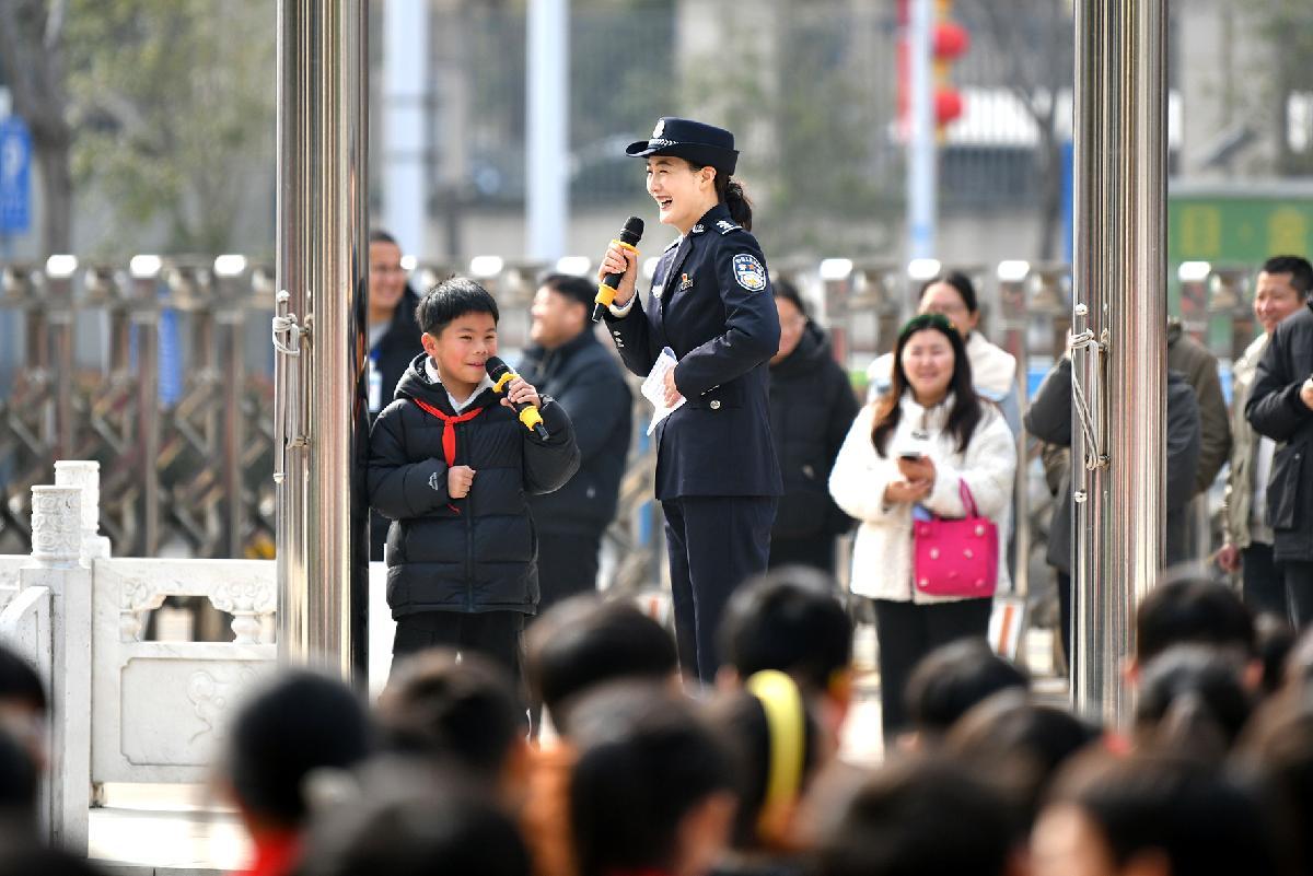 3月6日,安徽省阜南縣玉泉小學(xué)法治副校長(zhǎng)、阜南縣公安局民警劉盛楠在校園為學(xué)生們宣講安全防范知識(shí)。