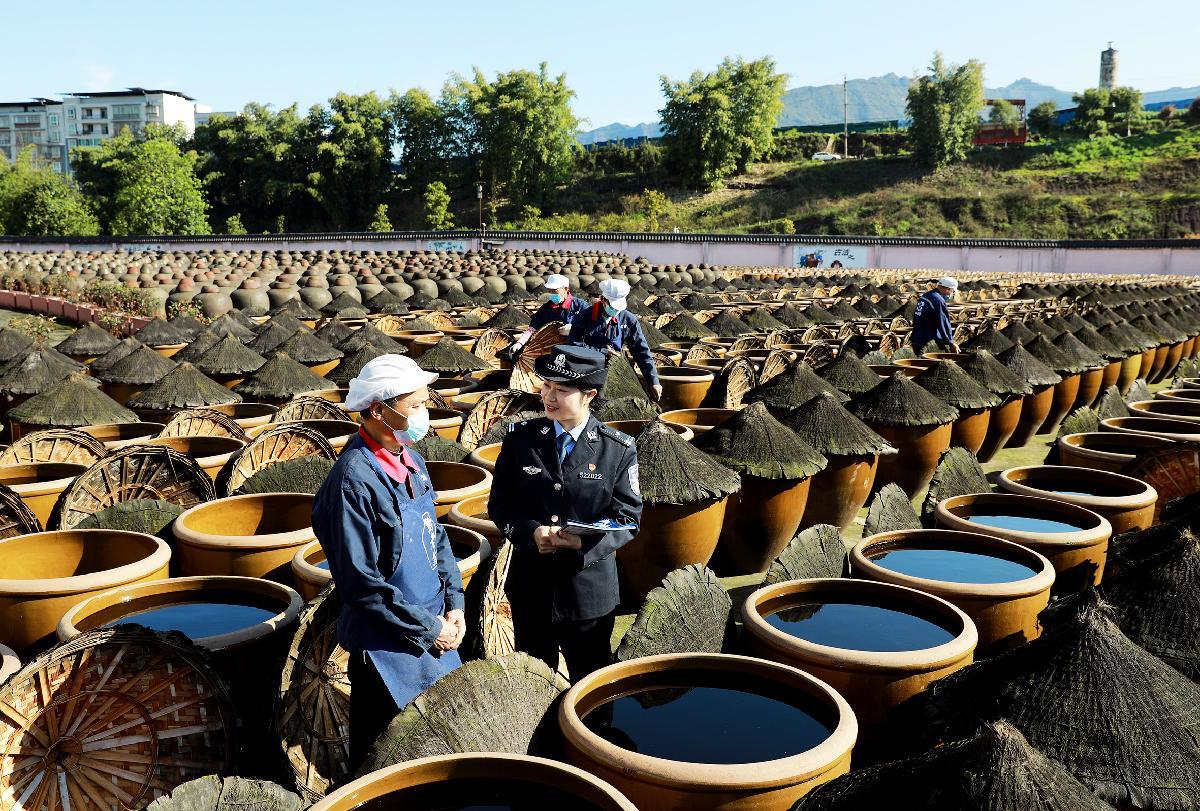 圖為3月10日,民警向一家曬醋企業(yè)工人了解生產(chǎn)經(jīng)營(yíng)情況。