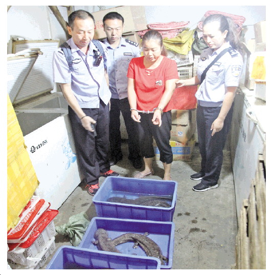 ▲ 犯罪嫌疑人正在向湖南省資興市森林公安民警指認(rèn)其無(wú)證銷售的野生娃娃魚。 本報(bào)記者 阮占江 本報(bào)通訊員 許志華 攝