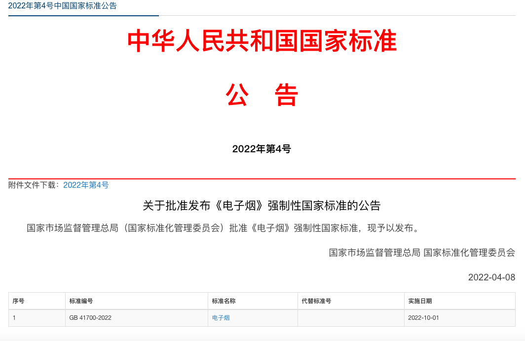 據(jù)國家標準化管理委員會官方網(wǎng)站消息,近日,國家市場監(jiān)督管理總局、國家標準化管理委員會批準《電子煙》強制性國家標準,現(xiàn)予以發(fā)布,自2022年10月1日起實施。