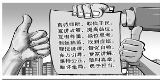 真誠傾聽,取信于民。宣講政策,提高站位?;ハ嘧鹬?,換位思考。剝絲抽繭,找到癥結(jié)。釋法說理,督促自檢。多方引導(dǎo),專家講解。秉持公正,敢叫真章。胸懷全局,勇于擔(dān)當(dāng)。