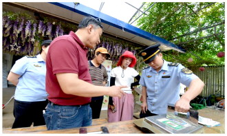進(jìn)入5月,北京市著名的櫻桃產(chǎn)區(qū)——通州區(qū)西集鎮(zhèn)的萬畝櫻桃即將成熟。近日,通州區(qū)市場監(jiān)督管理局和通州區(qū)計(jì)量檢測所的工作人員走進(jìn)櫻桃種植戶中間,為他們使用的電子秤提供集中上門檢定服務(wù),以精準(zhǔn)計(jì)量守護(hù)消費(fèi)者合法權(quán)益,護(hù)航特色農(nóng)業(yè)高質(zhì)量發(fā)展。圖為工作人員向種植戶發(fā)放宣傳頁,提示大家誠信經(jīng)營,杜絕電子秤作弊行為。