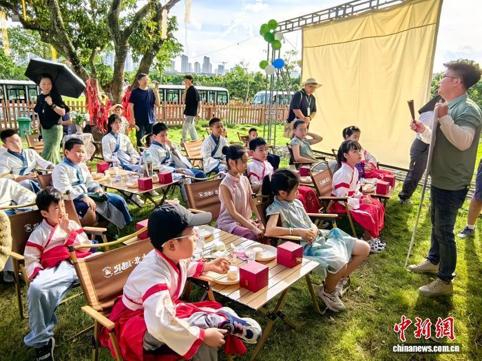“投壺是古代宴飲時(shí)做的一種投擲游戲,也是一種禮儀,請(qǐng)大家站在這里,把手中的箭投向壺里,投中就可以得分……”在“51趣·北大”帳篷營(yíng)地,“少年行”研學(xué)機(jī)構(gòu)的老師戴曙正帶著約20名兒童開(kāi)展研學(xué)活動(dòng)。