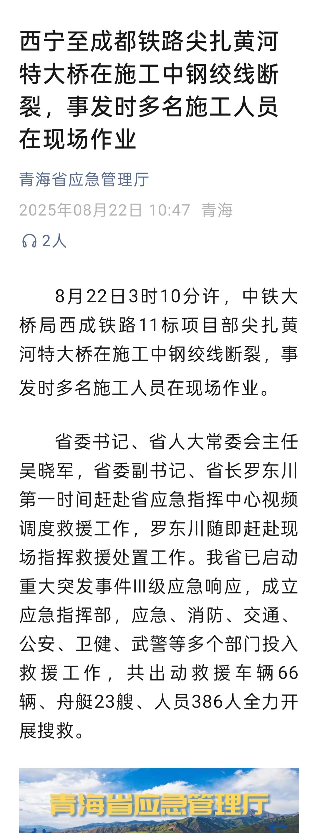 青海省應(yīng)急管理廳通報(bào)稱(chēng),8月22日3時(shí)10分許,中鐵大橋局西成鐵路11標(biāo)項(xiàng)目部尖扎黃河特大橋在施工中鋼絞線(xiàn)斷裂,事發(fā)時(shí)多名施工人員在現(xiàn)場(chǎng)作業(yè)。青海省委書(shū)記、省人大常委會(huì)主任吳曉軍,省委副書(shū)記、省長(zhǎng)羅東川第一時(shí)間趕赴省應(yīng)急指揮中心視頻調(diào)度救援工作,羅東川隨即趕赴現(xiàn)場(chǎng)指揮救援處置工作。青海省已啟動(dòng)重大突發(fā)事件Ⅲ級(jí)應(yīng)急響應(yīng),成立應(yīng)急指揮部,應(yīng)急、消防、交通、公安、衛(wèi)健、武警等多個(gè)部門(mén)投入救援工作,共出動(dòng)救援車(chē)輛66輛、舟艇23艘、人員386人全力開(kāi)展搜救。