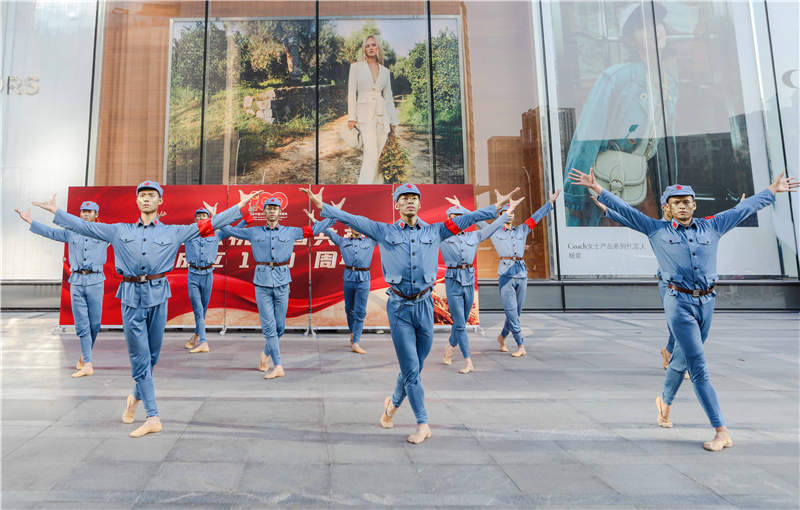 下午6時(shí)整,伴隨著鋼琴伴奏聲響起,稚嫩的童聲吸引了所有人的關(guān)注,歌曲《歌唱祖國》拉開了快閃活動的序幕。隨后,一群身著紅軍服飾的舞蹈演員,從展板后走向舞臺中央,一曲《筑夢紅軍》的舞蹈將精神煥發(fā)、熱情飽滿,不畏生死的昂揚(yáng)斗志表現(xiàn)得淋漓盡致,沖鋒在前、永不后退的革命精神感染了在場的市民。
