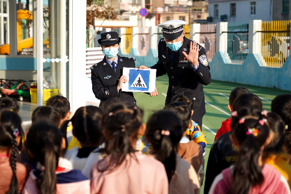 11月11日,浙江省舟山市公安局普陀分局展茅派出所聯(lián)合普陀交警大隊(duì)城北中隊(duì)走進(jìn)轄區(qū)螺門幼兒園,通過(guò)課堂教學(xué)、常見(jiàn)交通標(biāo)識(shí)講解、戶外模擬場(chǎng)景實(shí)地感受的方式,提升孩子們的交通安全意識(shí)。圖為民警向孩子們講解交通標(biāo)識(shí)。