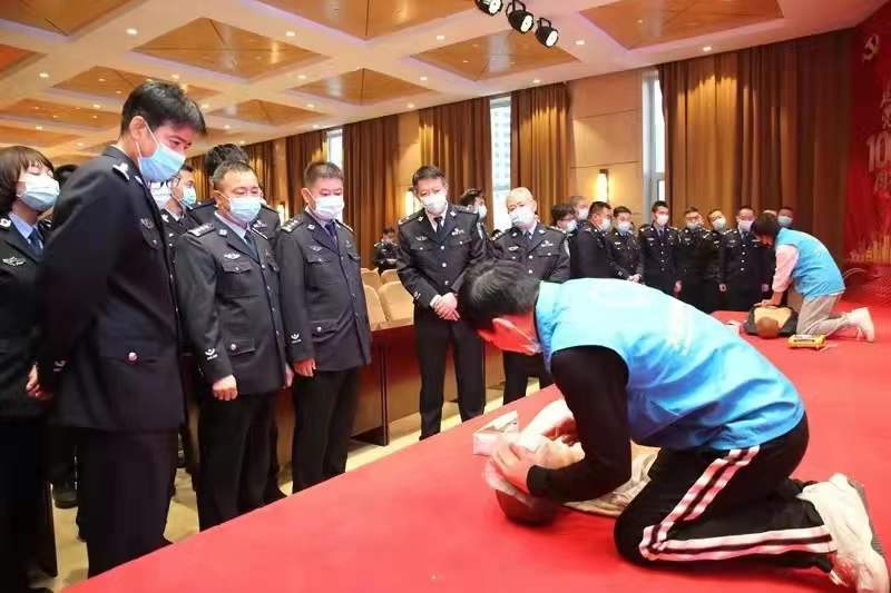 為進一步加強民警身心健康保護,為春運安保、冬奧安保打下基礎,近日,太原鐵路公安局大同公安處邀請山西省紅十字賑災救援搜救隊為全處干部民警開展應急救護技能培訓講座,進一步提高民警自救意識和急救水平。圖為培訓現(xiàn)場。