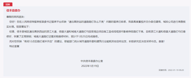 經(jīng)查,信豐縣城區(qū)通往高鐵西站的濱江大道、信雄大道和城南大道路燈均因受周邊項(xiàng)目施工造成線纜損壞影響導(dǎo)致路燈不亮,濱江大道和信雄大道路燈均已維修好,于2022年1月19日恢復(fù)了正常照明。
